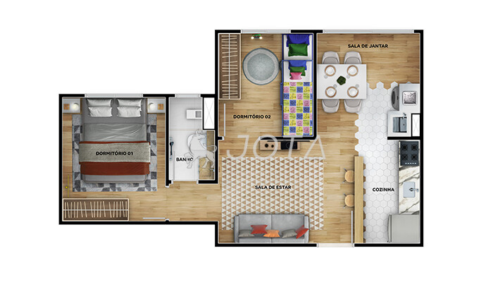 Seu apartamento, com cerca de 38m², foi projetado com inteligência: sala e cozinha integradas, 2 quartos (sendo 1 suíte em alguns modelos) e área de serviço.